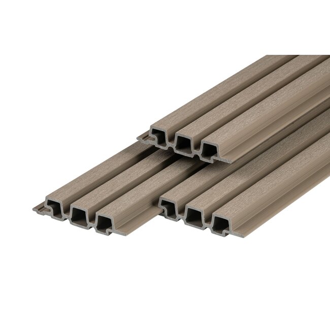 Composiet gevelbekleding in triple profiel, uitgevoerd in een moderne lichtgrijze kleur. De panelen zijn blind te monteren voor een strak en naadloos resultaat. Bijpassende hoek- en eindprofielen zijn optioneel verkrijgbaar voor een verzorgde afwerking. Lees meer.