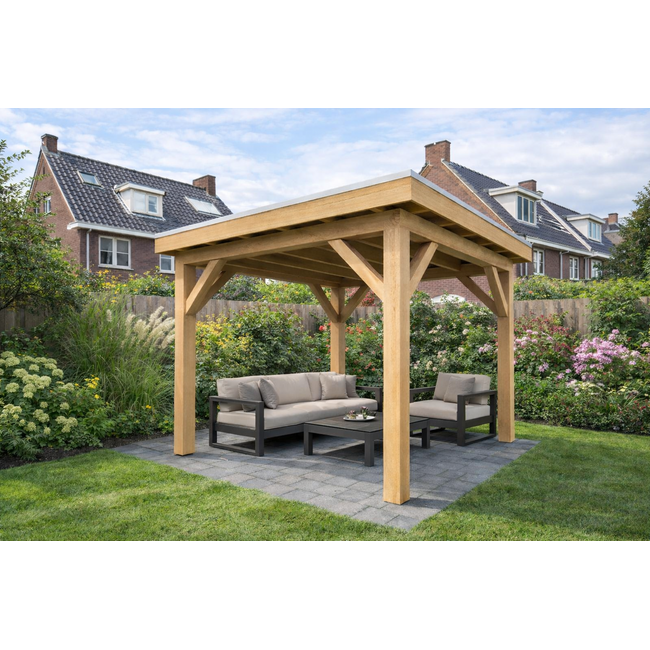 Bouwpakket voor een terrasoverkapping van Douglas hout met een afmeting van (dakmaat) 3x2,5 meter.