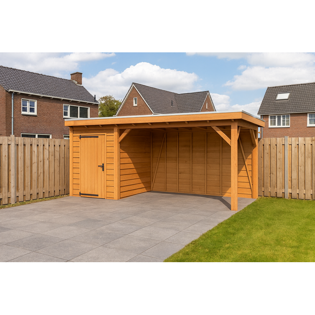 Met dit alles-in-één bouwpakket creëert u een hoogwaardige Douglas buitenruimte met een gesloten schuur en een open leefgedeelte. Sterk, duurzaam en perfect voor wie vrijheid wil in afwerking en indeling. Een betrouwbare basis voor jarenlang gebruik.