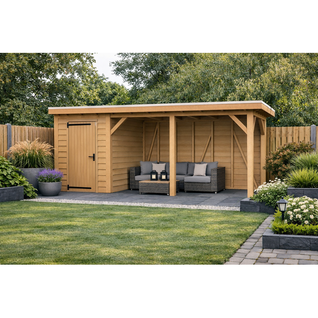 Met dit alles-in-één bouwpakket creëert u een hoogwaardige Douglas buitenruimte met een gesloten schuur en een open leefgedeelte. Sterk, duurzaam en perfect voor wie vrijheid wil in afwerking en indeling. Een betrouwbare basis voor jarenlang gebruik.