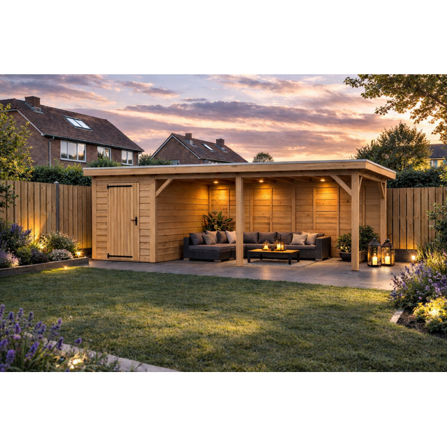 Met dit alles-in-één bouwpakket creëert u een hoogwaardige Douglas buitenruimte met een gesloten schuur en een open leefgedeelte. Sterk, duurzaam en perfect voor wie vrijheid wil in afwerking en indeling. Een betrouwbare basis voor jarenlang gebruik.