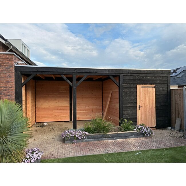 Schuur + overkapping met plat dak. Deze schuur heeft een dak maat van 300x675 cm en is door ons geplaatst.